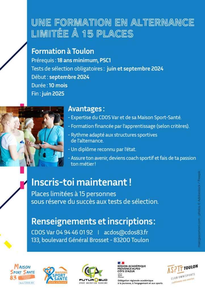 Alors que les premiers tests d’exigences préalables ont eu lieu le 17 juin, sachez qu’il ne reste que quelques places pour le BPJEPS spécialité  »Activités Physiques pour Tous » coloration  »sport-santé » que le CDOS 83 proposera après l’été pour la saison 2024-2025 avec l’ASPTT Toulon.