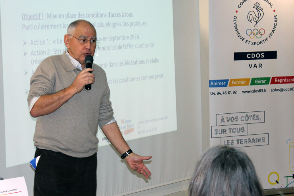 Après l’ouverture protocolaire, le Dr Pierre Trape, vice-président « sport-santé » du CDOS, a fait une présentation de la Stratégie Nationale Sport-Santé (SNSS) 2025-2030, proposée par le ministère des Sports. Il a notamment expliqué l’objectif global, les grands axes de la stratégie et les cibles principales et a insisté sur le rôle des clubs sportifs associatifs, à savoir accompagner et former les encadrants à la pratique du sport-santé, adapter les offres sportives, collaborer avec les acteurs locaux de sanré et du social, et intégrer le sport-santé dans leur projet sportif fédéral (PSF).