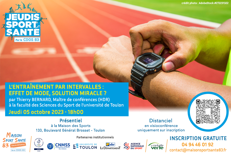 La première conférence de cette nouvelle saison des « JSS », « Entraînement par intervalles : effet de mode, solution miracle ? », se tiendra ce jeudi 5 octobre à 18h à Toulon dans notre Maison des Sports (133, Boulevard Général Brosset).