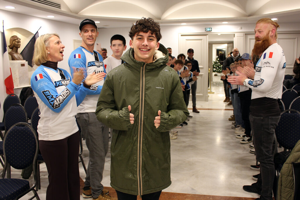 Il ne s’attendait pas à ça ! Il y a quelques semaines, Franck Chapon, le président de son club, lui avait bien dit qu’il serait prochainement valorisé par le CDOS 83 suite à ses titres internationaux obtenus durant l’année, mais sans plus de précisions. Alors quand il est arrivé en mairie de Sainte-Maxime ce mercredi 3 décembre, avec la complicité de ses parents, qu’il a ouvert la porte de la salle du conseil municipal et qu’il a découvert le maire de la ville Vincent Morisse, la conseillère départementale Véronique Lenoir et une trentaine de membres du BMX Maximois, dont certains en tenue de pilote qui lui avaient préparé une haie d’honneur, Ethan Simionato-Fusztey n’en revenait pas … et ce n’était pas fini …