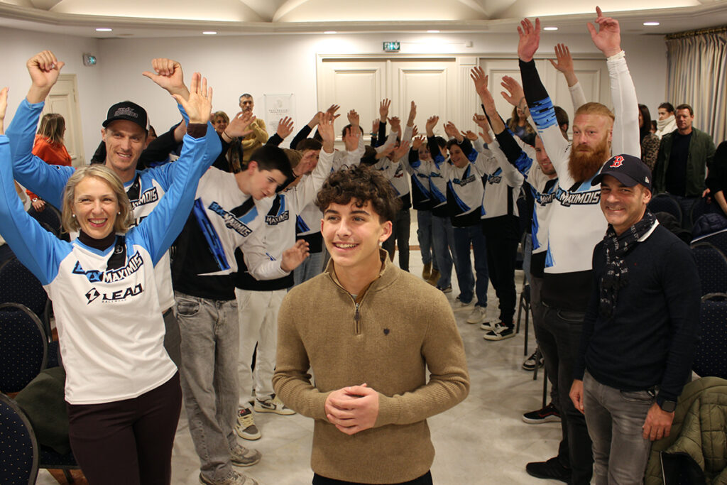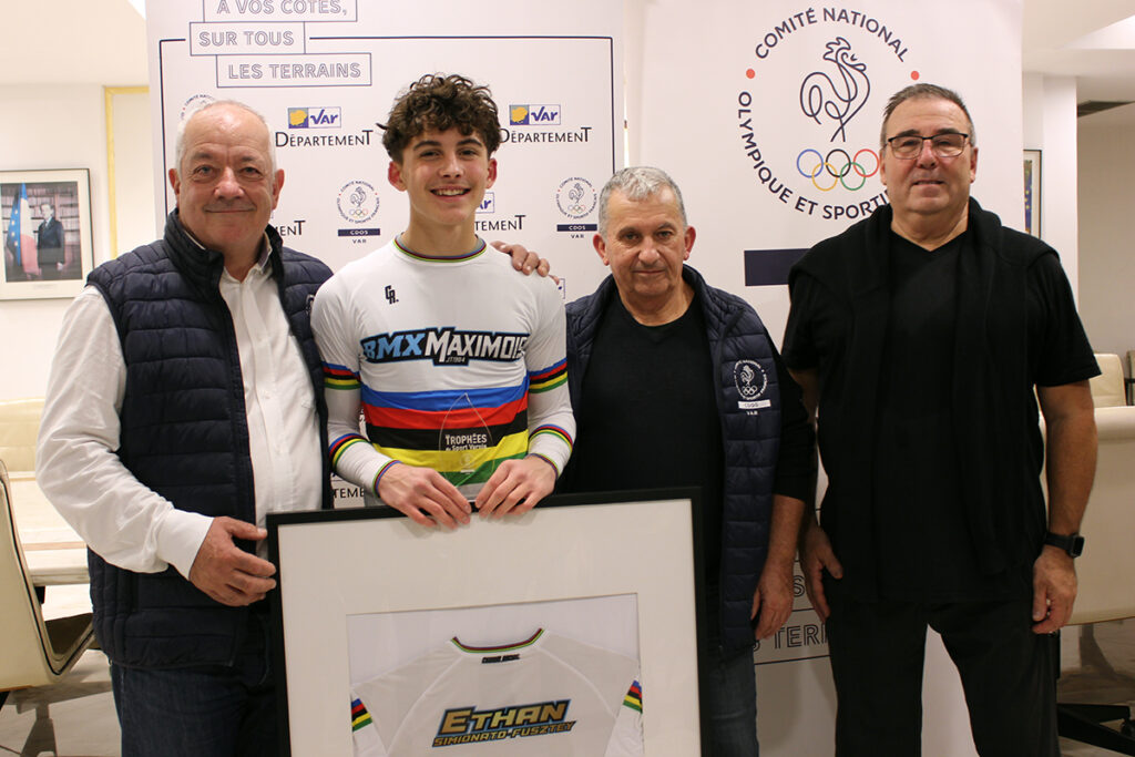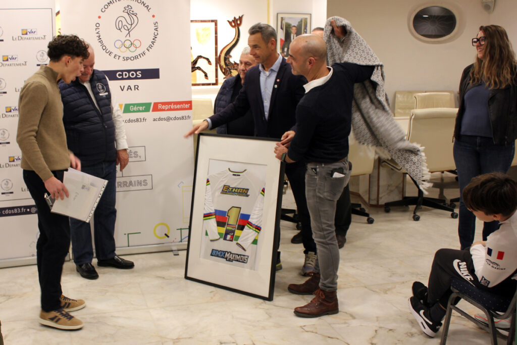 Les discours terminés, place aux récompenses. Comme à chaque cérémonie, le CDOS 83 a remis au lauréat un trophée, un diplôme et un bon d’achat de 50€ offert par « Terre de Running », partenaire du dispositif ainsi qu’un bon de 100€ remis au club pour l’achat d’équipements sportifs. Mais comme annoncé initialement, les surprises pour Ethan n’étaient pas finies. À l’approche des fêtes de fin d’année, c’était Noël avant l’heure pour le pilote, qui a reçu de la part de son club deux maillots aux couleurs arc-en-ciel, « normalement attribués aux champions du monde dans le milieu du cyclisme » précise Franck Chapon, une « prime exceptionnelle de 1500€ » du Conseil départemental ainsi qu’un chèque de 1550€ à travers l’association, remis par la ville. « Il n’était pas question de se faire doubler par le Département » s’est amusé le maire maximois pour conclure cette belle cérémonie.
