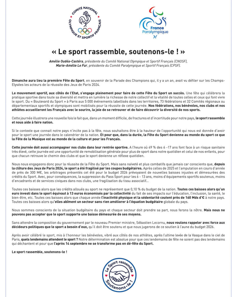Sans attendre la composition du gouvernement par le nouveau Premier ministre, Sébastien Lecornu, nous voulons rappeler avec force aux décideurs politiques que le sport a besoin d’eux, qu’il doit être soutenu et que nous jugerons de ce soutien à l’aune du budget 2026.