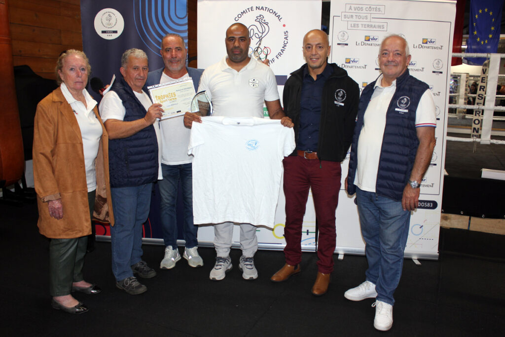 Plus à l’aise au bord d’un ring que pour parler au micro devant une telle assemblée, le héros du soir a tout de même pris la parole : « Merci à tous d’avoir répondu présents à mon invitation : mes élèves, les adhérents du club, les acteurs des quartiers et les partenaires qui m’aident souvent, les élus toulonnais et le CDOS pour cette récompense, ça me fait vraiment chaud au coeur. Et merci aussi à ceux qui m’accompagnent dans l’ombre ». Avant de terminer la cérémonie par un apéritif convivial offert par le club, « Momo » Maghraoui a reçu un « Trophée du Sport Varois », un diplôme et un bon d’achat offert par « Terre de Running » (enseigne partenaire de la manifestation) des mains des membres de la commission « valorisation », qui ont également remis au président du club un bon d’achat de 100€ offert par le CDOS 83.