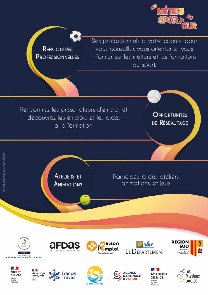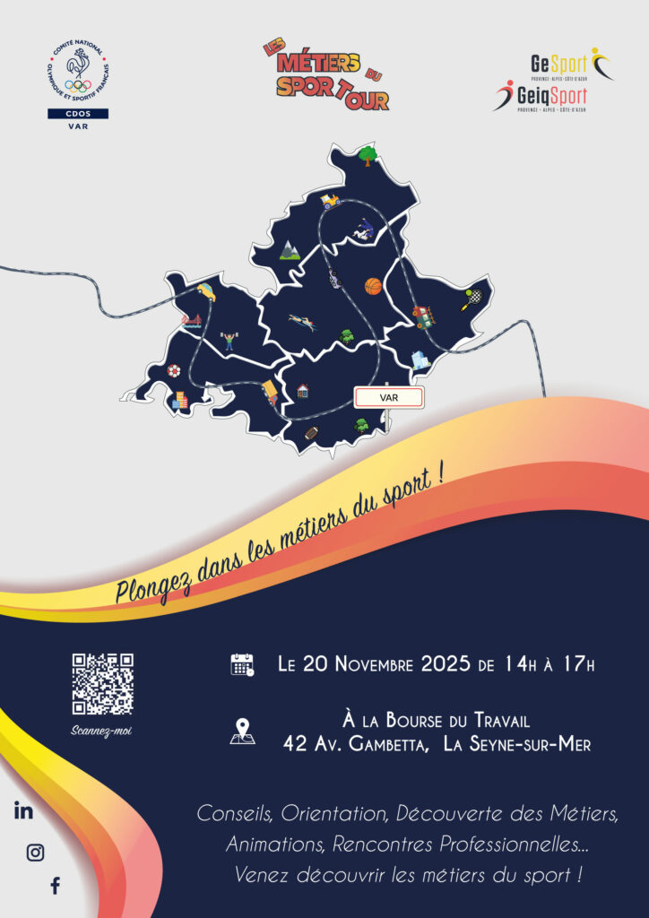 Cette année, « Les Métiers du Sport Tour » feront halte dans le Var le jeudi 20 novembre 2025 à La Seyne-sur-Mer, à la Bourse du Travail (42 avenue Gambetta).