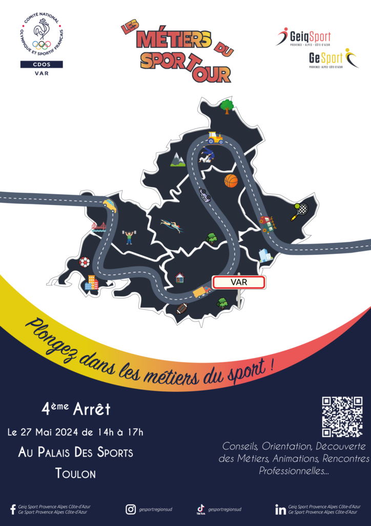 Un rendez-vous à ne pas manquer si vous êtes intéressés par les professions et les formations autour du sport : après Marseille, l’Isle-sur-la-Sorgue et Manosque, « les Métiers du Sport Tour » se dérouleront dans le Var le lundi 27 mai de 14h à 20h, au Palais des Sports de Toulon.