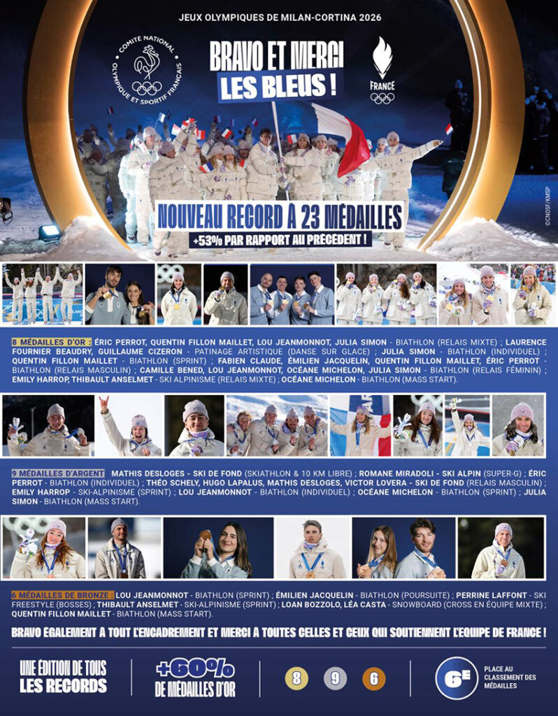 L’Équipe de France Olympique a réalisé, aux Jeux Olympiques d’hiver de Milan-Cortina 2026, la plus grande performance de son histoire avec 23 médailles, battant le précédent record (15 médailles) établi lors des éditions 2014 (Sotchi) et 2018 (PyeongChang), avec une progression de plus de 53%. Elle a également établi un nouveau record du nombre de titres olympiques avec 8 médailles d’or, dépassant les cinq sacres enregistrés en 2018 et 2022 (Pékin).