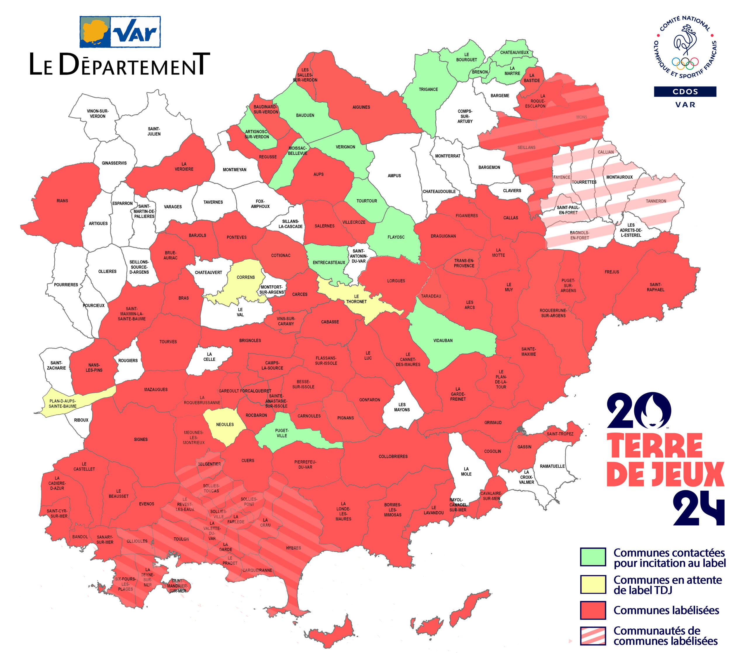 les 93 villes labélisées : Aiguines, Aups, Bandol, Barjols, Baudinard-sur-Verdon, Belgentier, Besse-sur-Issole, Bormes-les-Mimosas, Bras, Brignoles, Brue-Auriac, Cabasse, Callas, Camps-la-Source, Carcès, Carnoules, Carqueiranne, Cavalaire-sur-Mer, Claviers, Cogolin, Collobrières, Cotignac, Cuers, Draguignan, Evenos, Figanières, Flassans-sur-Issole, Forcalqueiret, Fréjus, Garéoult, Gassin, Gonfaron, Grimaud, Hyères-les-Palmiers, La Bastide, La Cadière d’Azur, La Crau, La Farlède, La Garde, La Garde-Freinet, La Londe-les-Maures, La Motte, La Roque-Esclapon, La Roquebrussane, La Seyne-sur-Mer, La Valette-du-Var, La Verdière, Le Beausset, Le Cannet-des-Maures, Le Castellet, Le Lavandou, Le Luc-en-Provence, Le Muy, Le Plan-de-la-Tour, Le Pradet, Le Revest-les-Eaux, Les Arcs-sur-Argens, Les Salles-sur-Verdon, Lorgues, Mazaugues, Méounes-les-Montrieux, Nans-les-Pins, Ollioules, Pierrefeu-du-Var, Pignans, Pontevès, Puget-sur-Argens, Rayol-Canadel-sur-Mer, Régusse, Rians, Rocbaron, Roquebrune-sur-Argens, Saint-Cyr-sur-Mer, Saint-Mandrier-sur-Mer, Saint-Maximin-la-Sainte-Baume, Saint-Raphaël, Saint-Tropez, Sainte-Anastasie-sur-Issole, Sainte-Maxime, Salernes, Sanary-sur-Mer, Seillans, Signes, Six-Fours-les-Plages, Solliès-Pont, Solliès-Toucas, Solliès-Ville, Taradeau, Toulon, Tourves, Trans-en-Provence, Villecroze, Vins-sur-Caramy