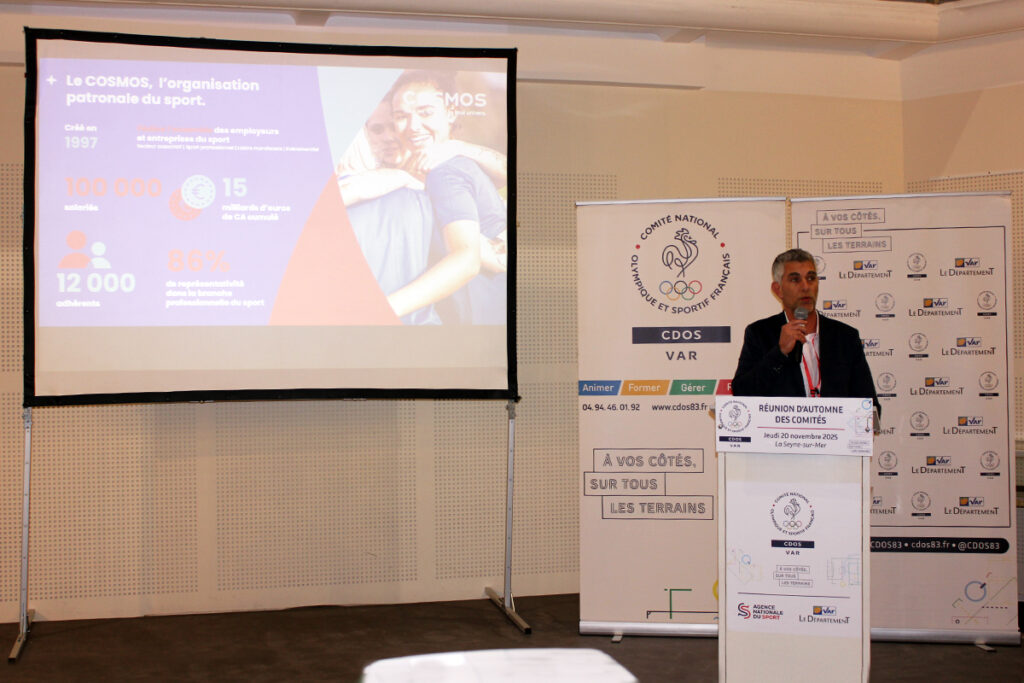 Le temps des discours protocolaires passé, Xavier Grande a fait une présentation du COSMOS, l’organisation patronale représentant l’ensemble des employeurs du sport : « Le COSMOS est le syndicat majoritaire dans le champs sportif et représente aussi bien le secteur associatif que le sport professionnel, soit 12 000 employeurs. Nous avons trois missions : accompagner, négocier avec les partenaires sociaux et représenter les intérêts de nos adhérents ».