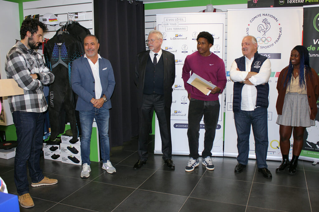 Auparavant, Matis Bardon, responsable du magasin « Terre de running » de La Garde qui a accueilli la cérémonie avait remercié les personnes présentes avant d’adresser un mot particulier au jeune athlète : « Weaven, toute l’équipe tient à te féliciter. On te suit depuis plusieurs années et on veut poursuivre cette collaboration. On te souhaite le meilleur pour l’avenir alors continue comme ça », tandis que Marcel Albert, Chokri Oueslati et Erick Plavis, membres de la commission « valorisation » du CDOS 83, expliquent le fonctionnement du comité et ce qui les a amené à récompenser Weaven Metainville, à qui ils ont remis un « Trophée du Sport Varois », un diplôme ainsi qu’un bon d’achat de 50€ offert par « Terre de Running ».